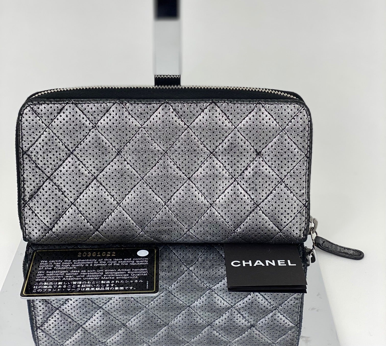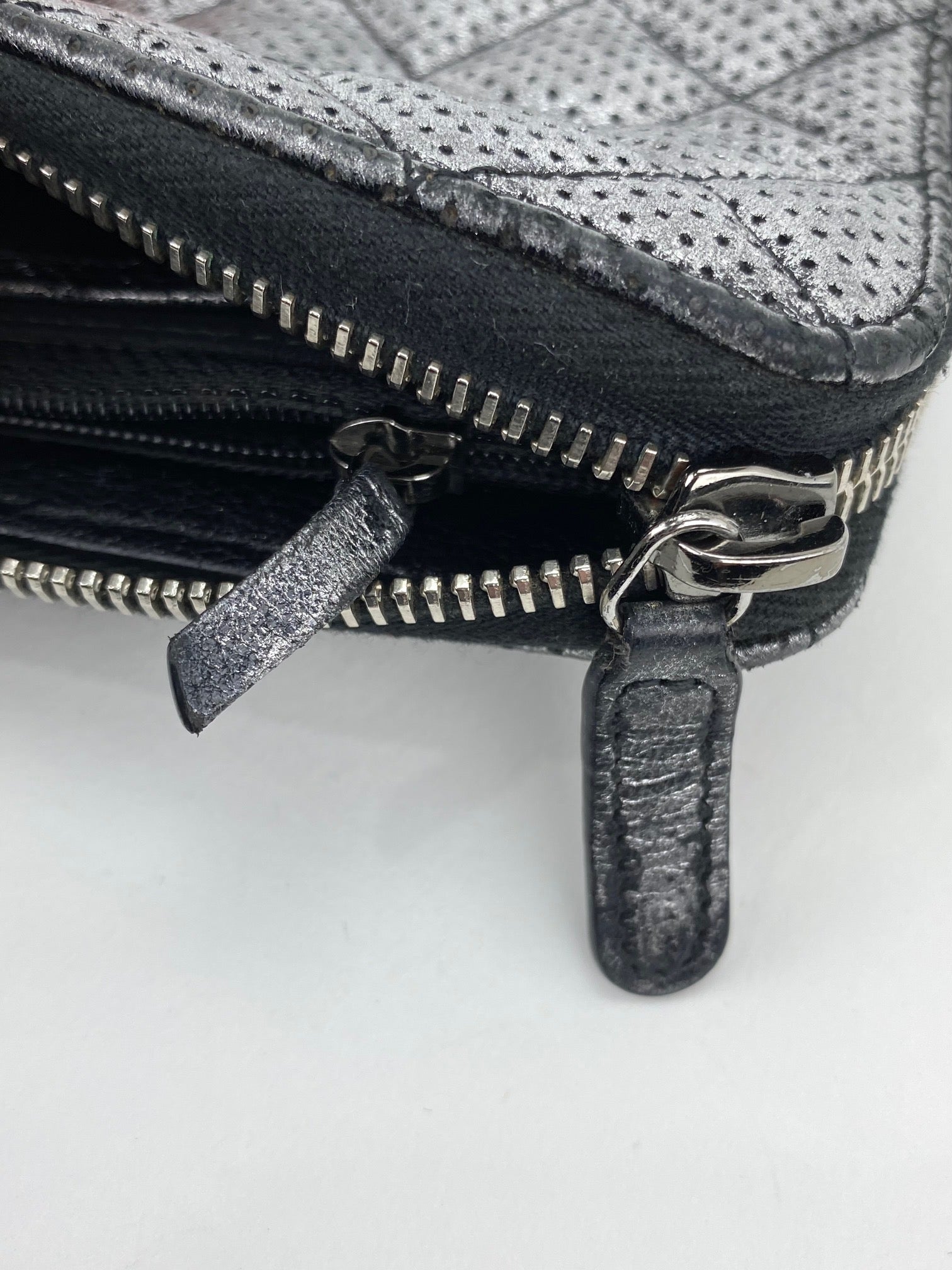 Chanel Perforated Silver Metallic Lambskin Quilted Zip Around Wallet Clutch