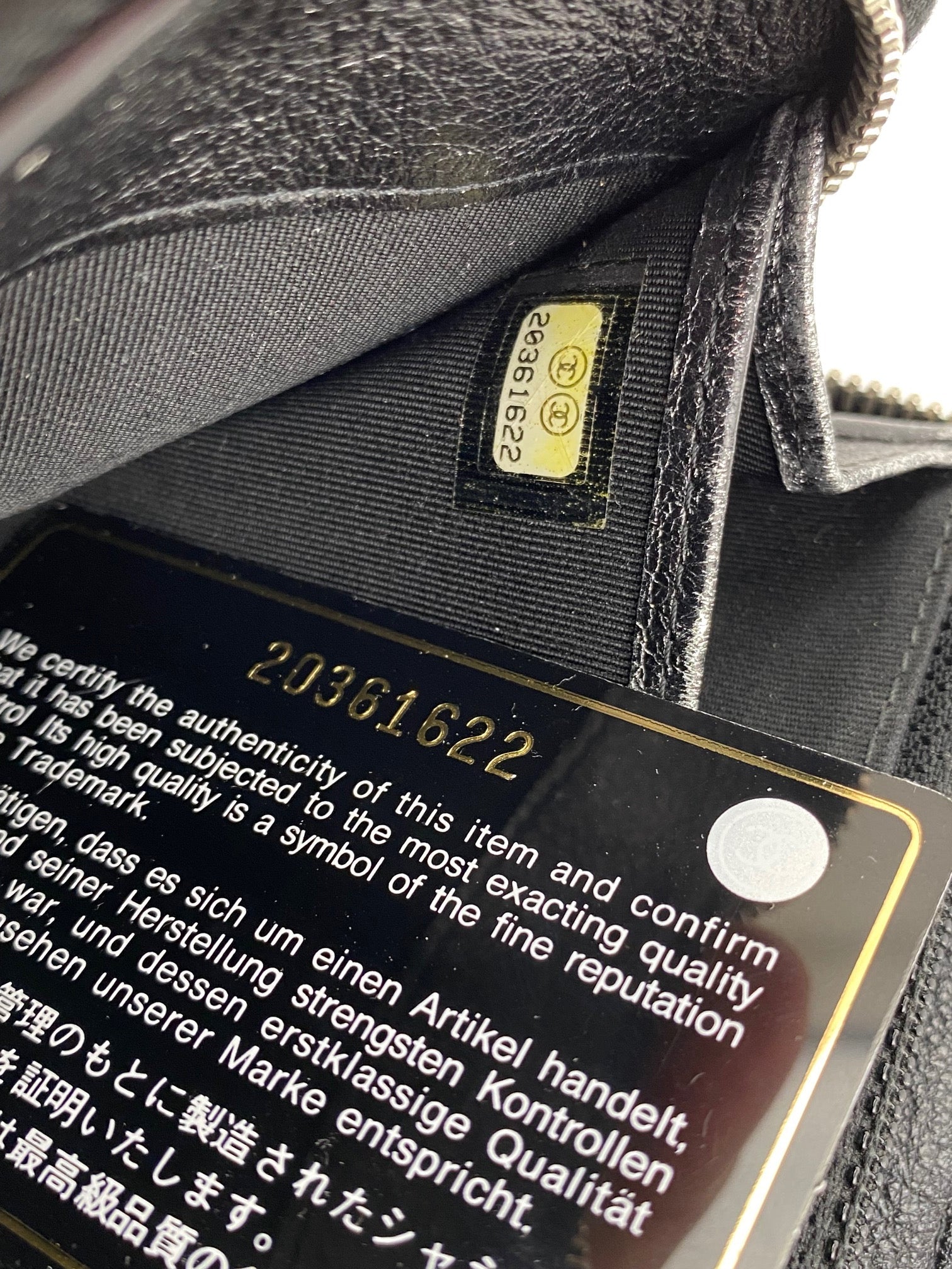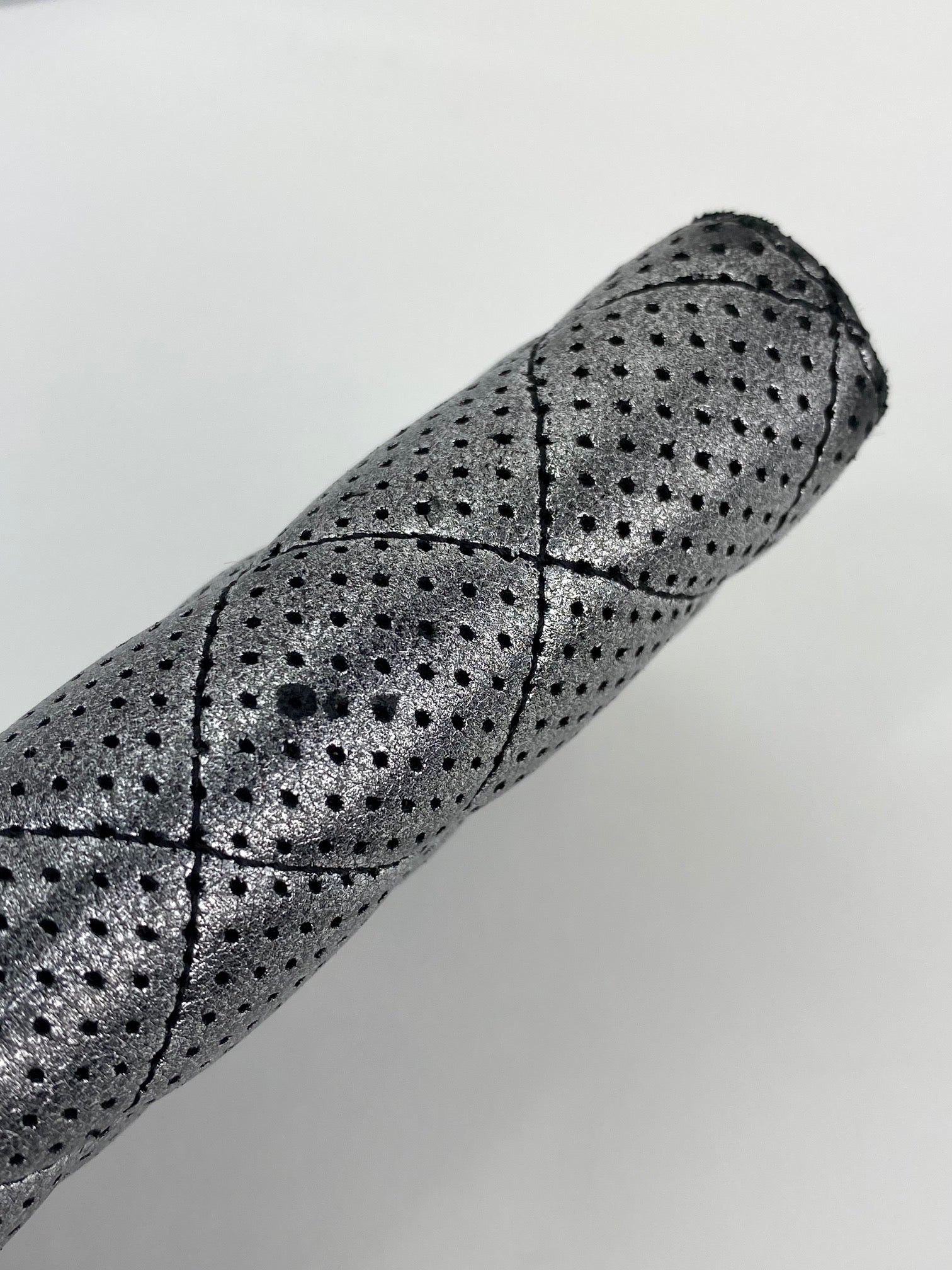 Shine bright with this Chanel perforated silver metallic lambskin wallet—a glamorous clutch that's got serious sparkle! This B- rated beauty shows authentic wear that only adds to its edgy appeal. The delicate metallic silver leather features Chanel's signature quilted pattern and perforated details, while the zip-around closure keeps your essentials secure. The compact 4" x 8" x 1.2" size fits perfectly in your pocket or evening bag. Sure, the corners show some metallic wear and a few spots display color fading—that's the nature of this luxe material—but it only proves this piece has lived a fabulous life. The black metallic leather interior shows some wear with silver