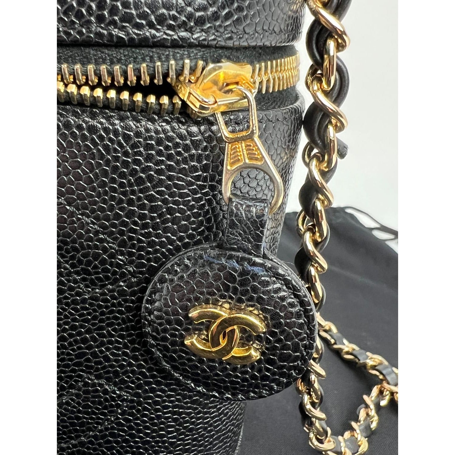 Travel back in time with this vintage Chanel Vanity cosmetic case from 1994-1996—a timeless treasure that's still turning heads! This A/B-rated classic features luxurious black caviar leather in excellent condition with only minor wear. The compact 7" x 6" x 5" silhouette is perfect for organizing your beauty essentials or as a chic standalone piece. Dual carrying options include a short handle (1" drop) and an adjustable strap (20" drop), plus a bonus unbranded 42" strap for extra versatility. The pristine black leather interior keeps everything organized, while 24k gold-plated hardware with minimal wear adds vintage glamour. This heritage piece comes complete with the Chanel dust bag and authenticity card. Ships same day or next!