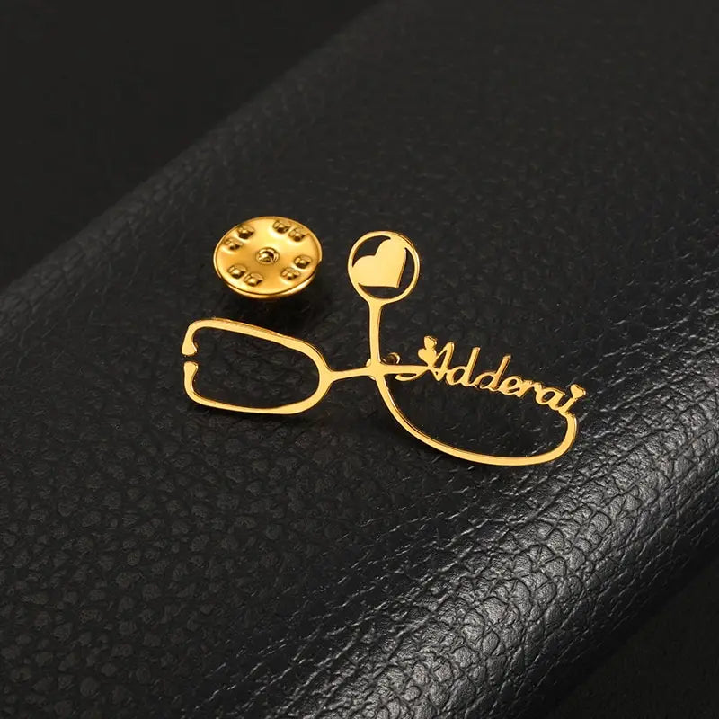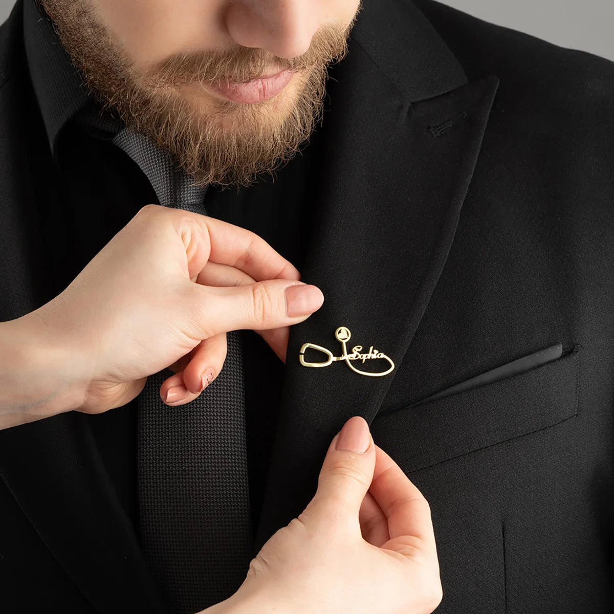 Make a fashionable statement while proudly displaying your profession with this Custom Heart Stethoscope Name Brooch Pin. Whether you're a doctor, nurse or other valued healthcare professional, this personalized gift is perfect for showing off your love for healthcare. Plus, the high-quality stainless steel material ensures durability and longevity, making this a practical accessory for any healthcare professional. Available in both trendy and timeless styles, this brooch pin is a must-have addition to any jewelry collection. Suitable for both men and women, this versatile piece can be worn with any outfit to add a touch of personality and charm. Show off your unique sense of style and passion for healthcare with this fun and playful brooch pin.